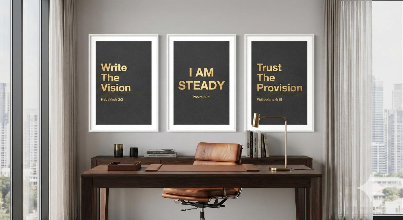 This isn't just wall art—it’s a daily spiritual anchor for the modern man of faith. The I AM STEADY series was curated for the visionary who leads with strength, operates in peace, and understands that every great work begins with a firm foundation in the Word.