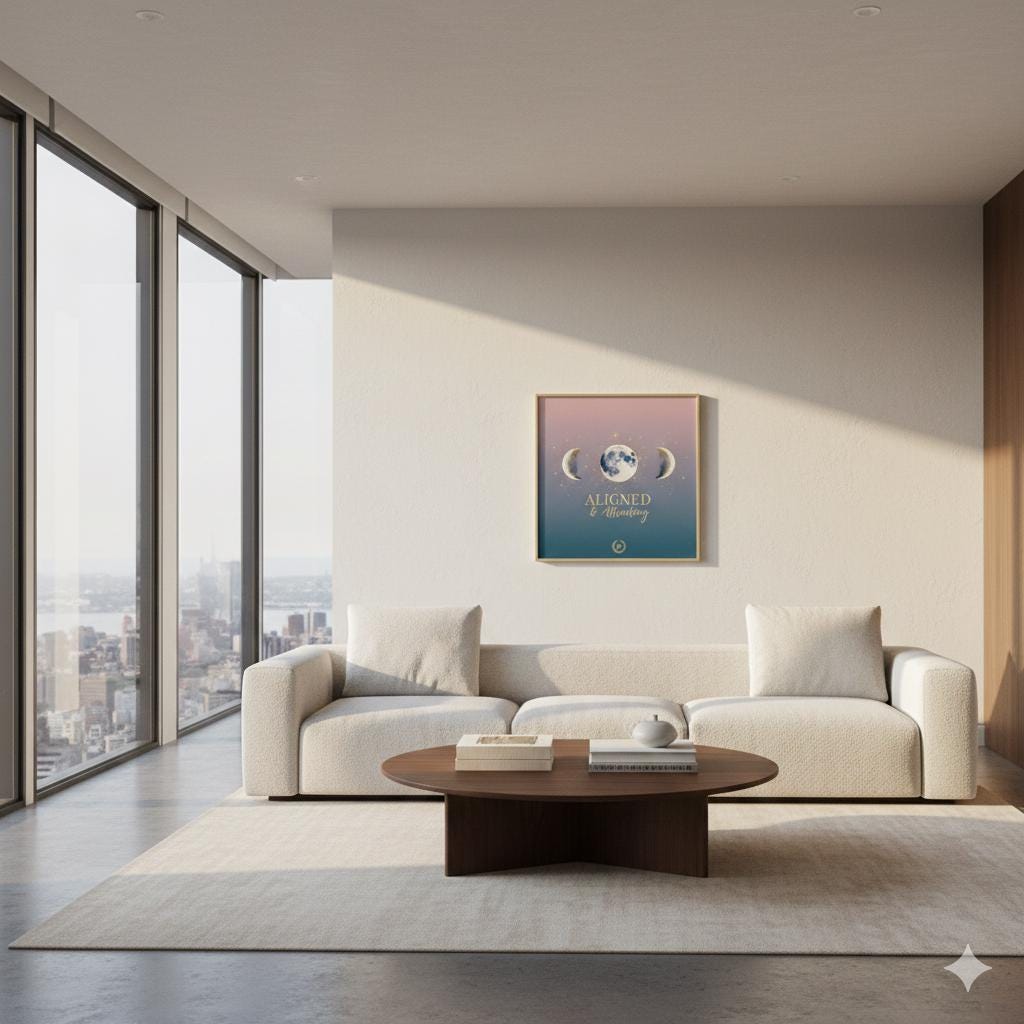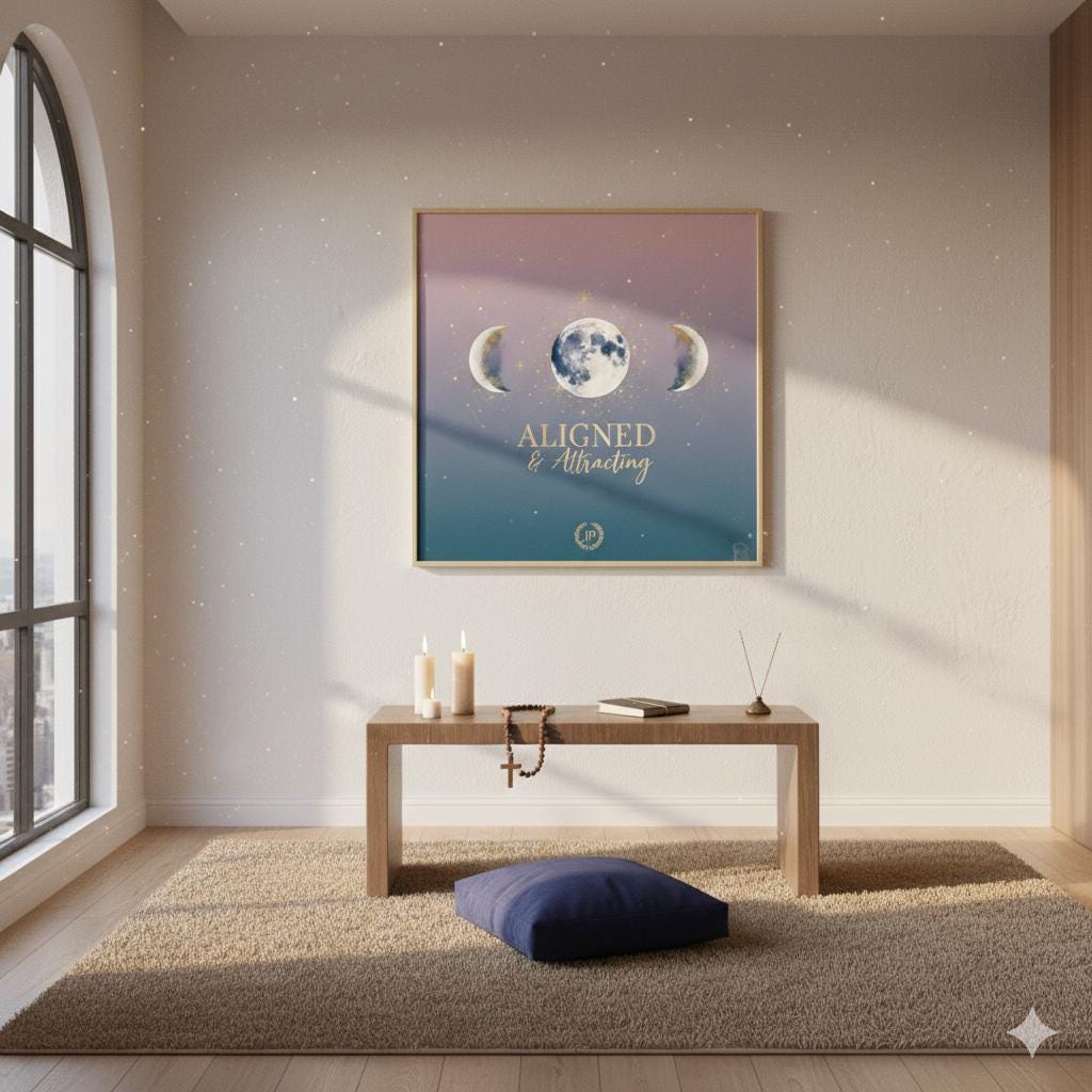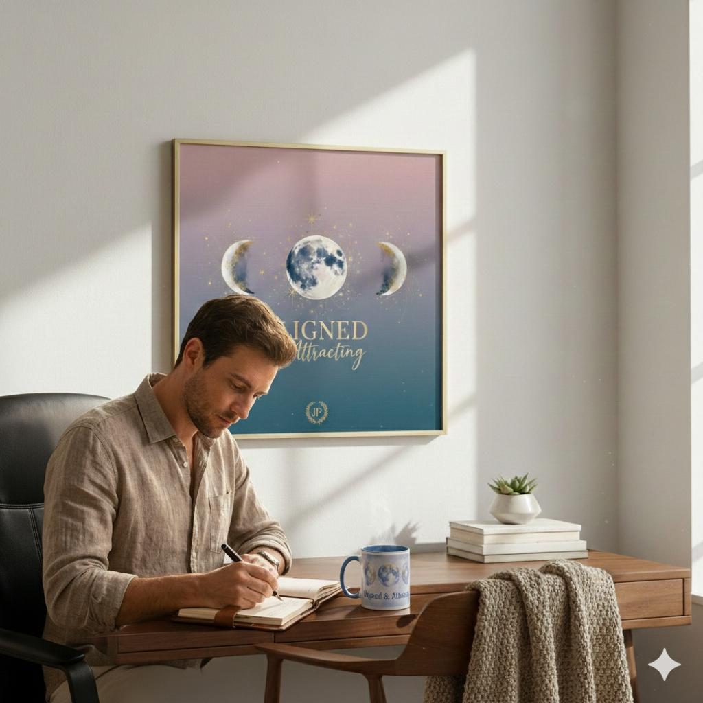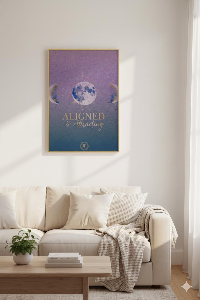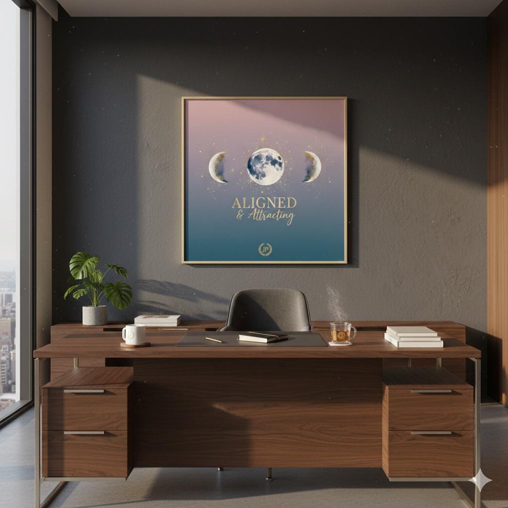 The Aligned & Attracted masterwork is a centerpiece for the modern legacy builder who understands the power of spiritual and mental positioning. Featuring a striking three-phase lunar design set against a gradient "Melanin Luxe" backdrop, this piece combines ethereal textures with our signature gold-tone executive typography. It serves as a daily visual anchor, reminding you that when your actions align with your purpose, the provision follows.