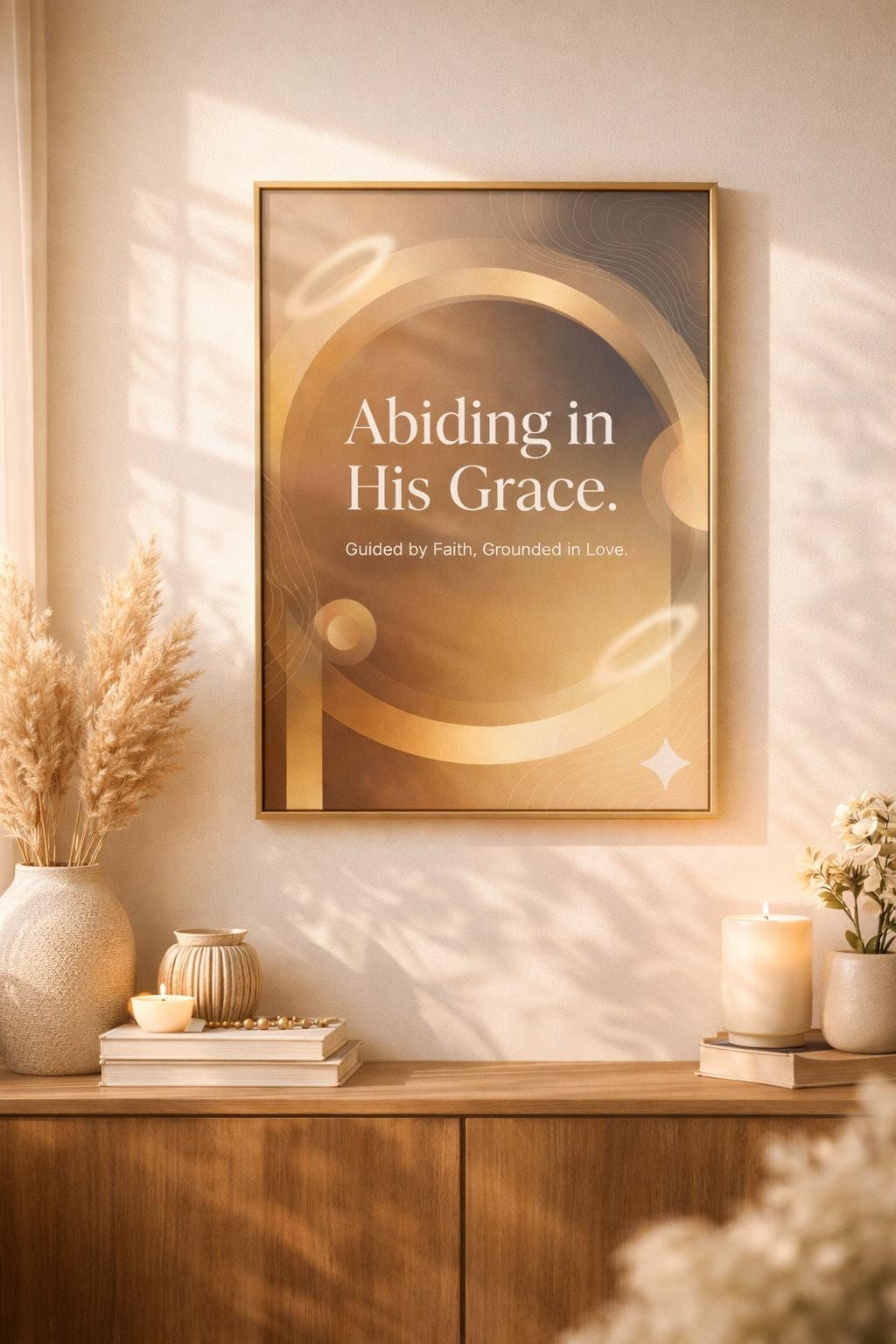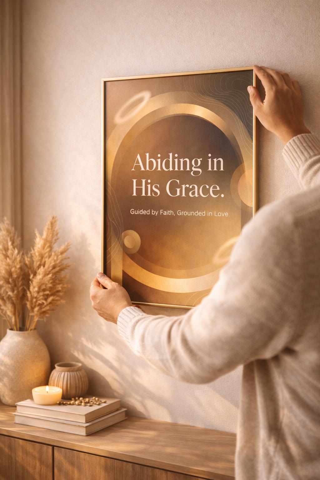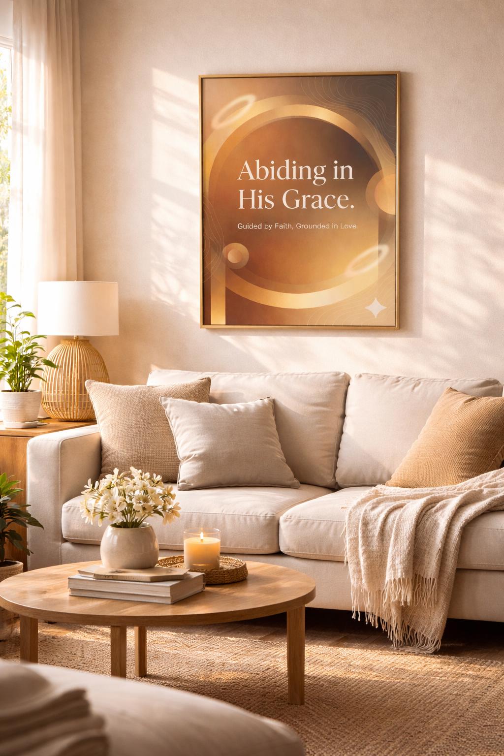 This “Abiding in His Grace” faith-inspired poster brings a soft, peaceful presence into any room. The warm neutral tones, gold accents, and gentle abstract shapes make it feel modern, luxurious, and grounded—perfect for anyone who wants their space to reflect their walk with God.