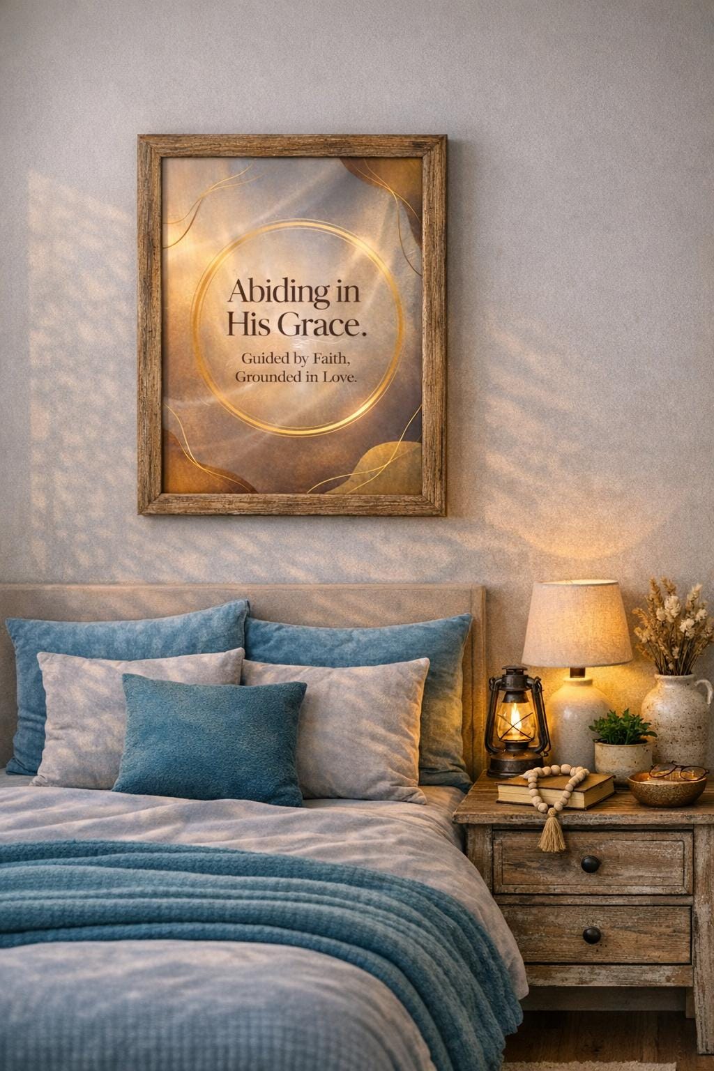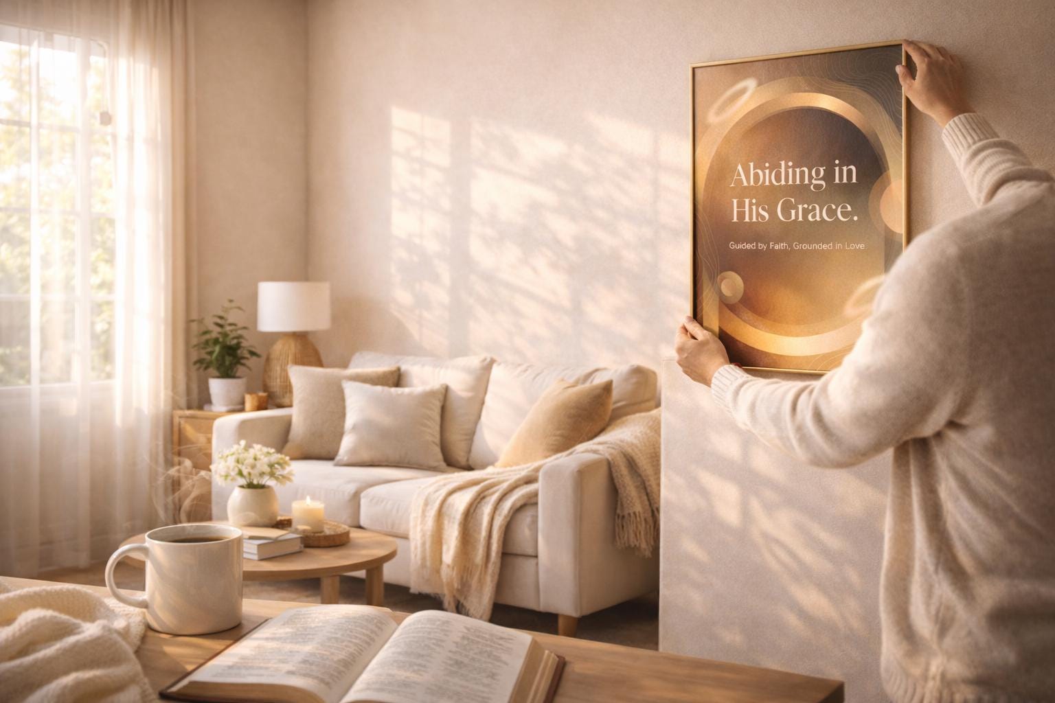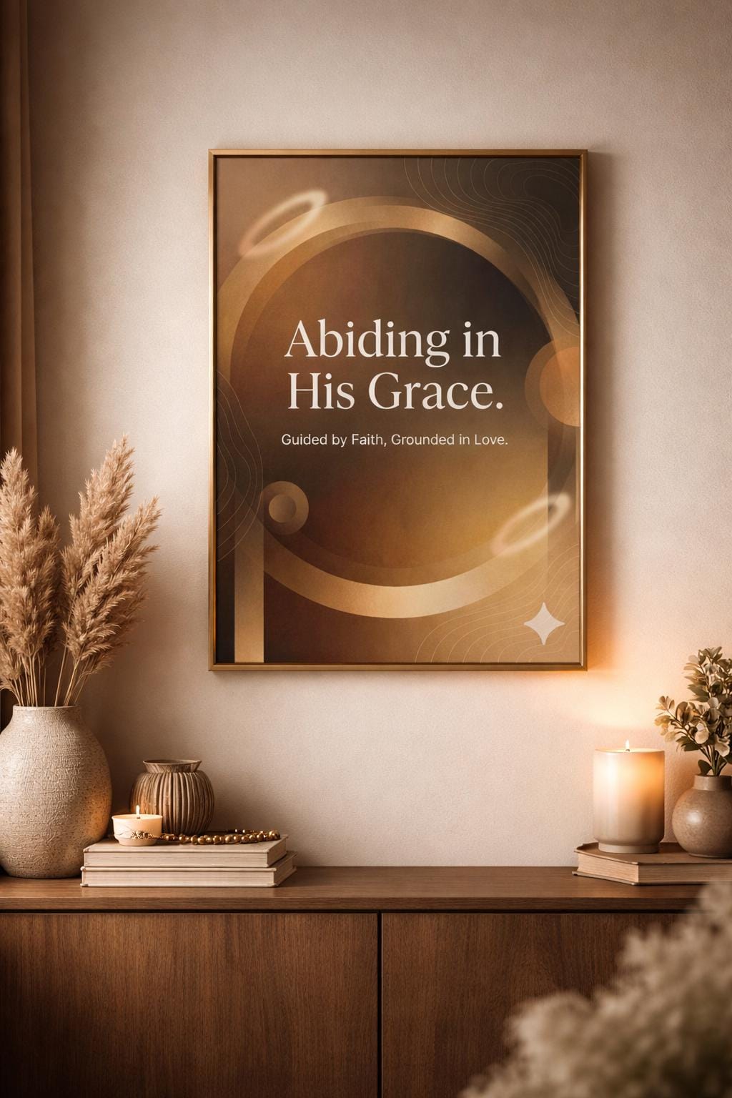 This “Abiding in His Grace” faith-inspired poster brings a soft, peaceful presence into any room. The warm neutral tones, gold accents, and gentle abstract shapes make it feel modern, luxurious, and grounded—perfect for anyone who wants their space to reflect their walk with God.