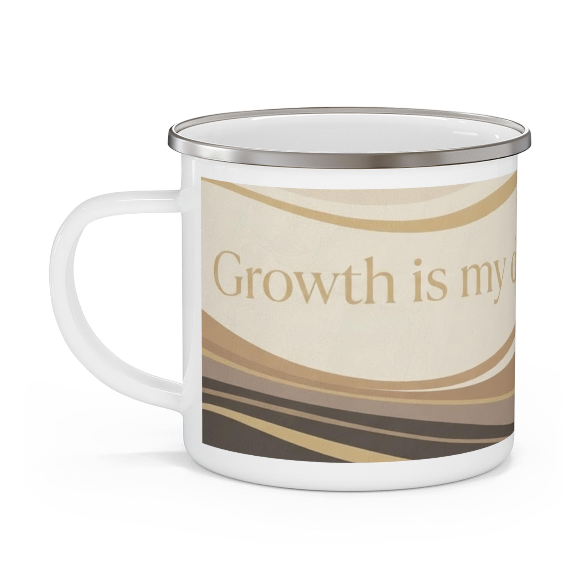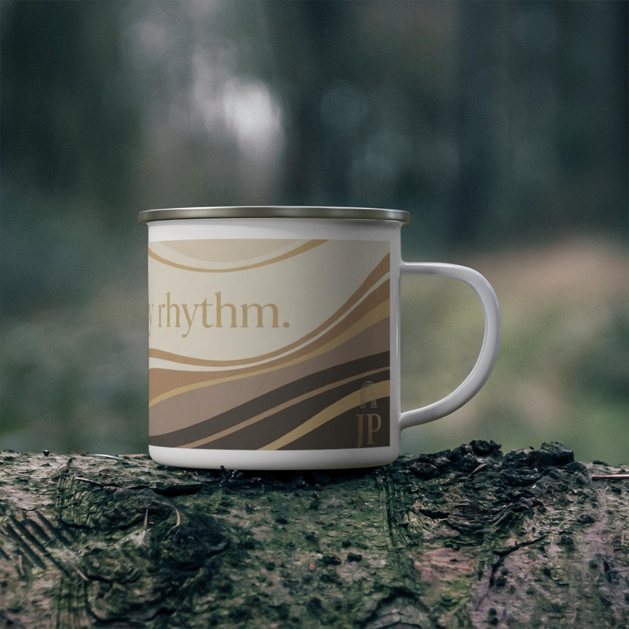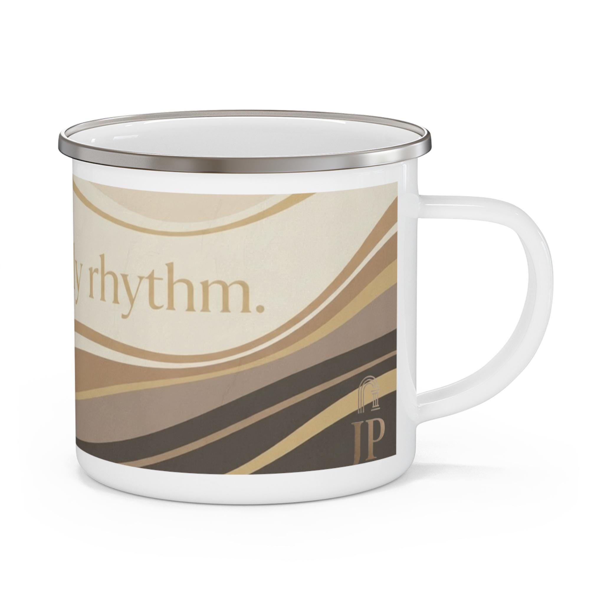 This 12oz enamel mug features the JP Collective design “Growth Is My Daily Rhythm” in warm neutral waves and gold-inspired accents. It’s made for slow morning coffee, trail breaks, and everyday reminders that you’re evolving on purpose.