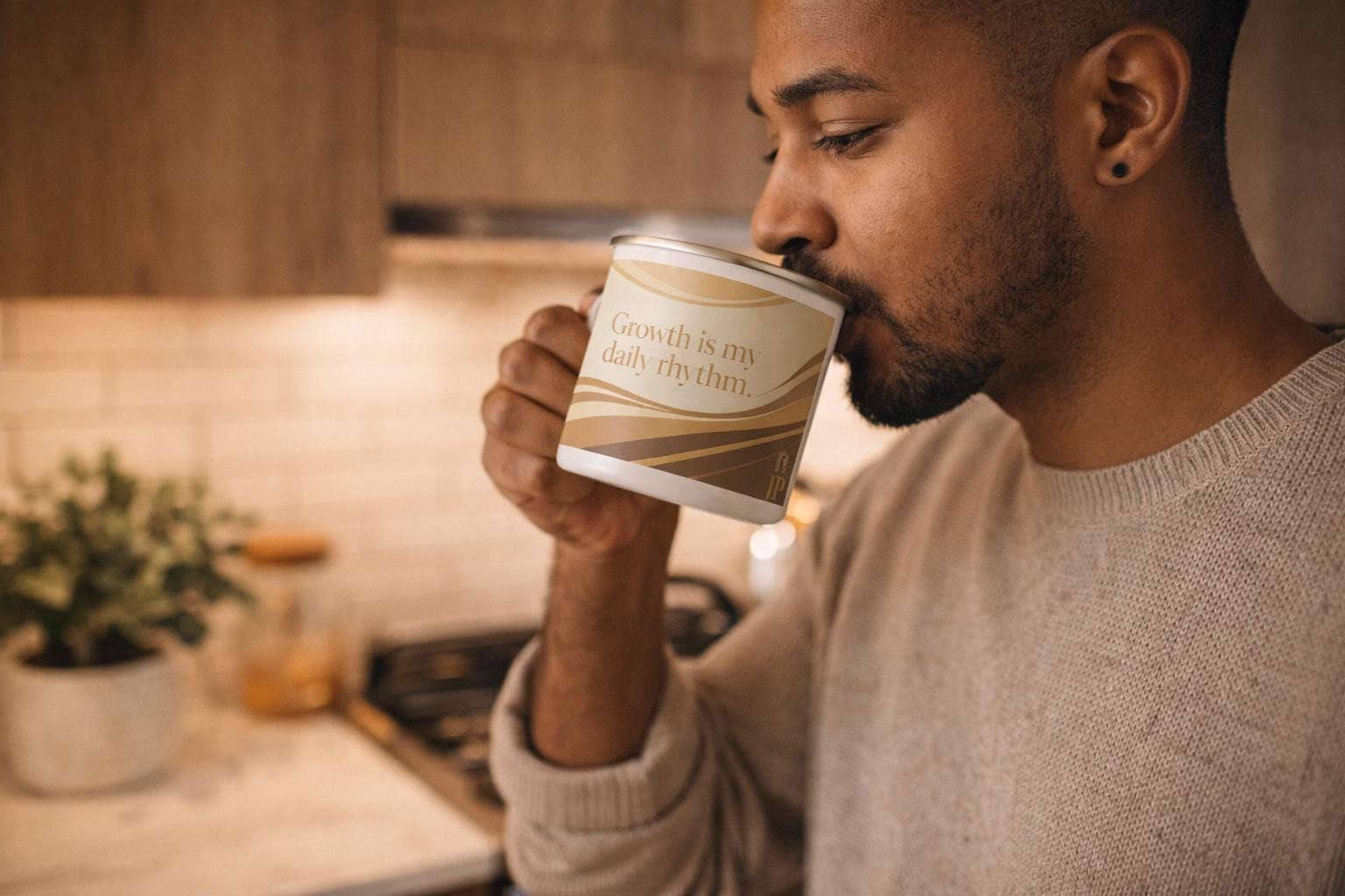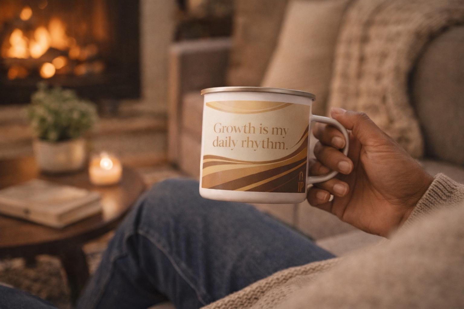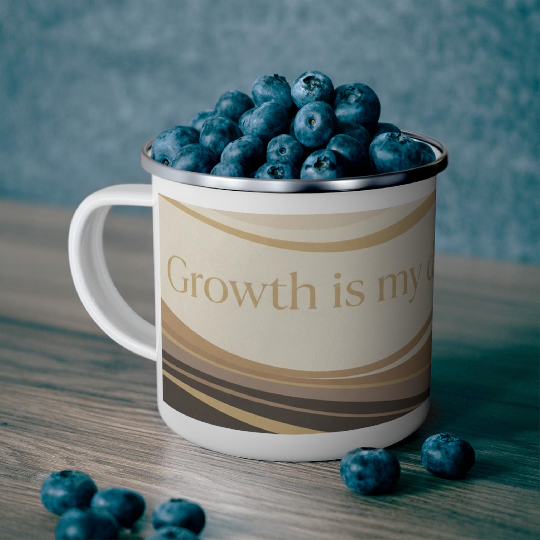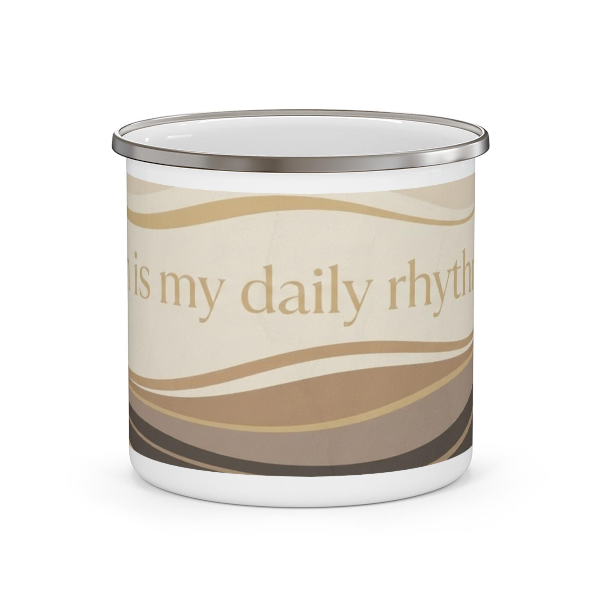 This 12oz enamel mug features the JP Collective design “Growth Is My Daily Rhythm” in warm neutral waves and gold-inspired accents. It’s made for slow morning coffee, trail breaks, and everyday reminders that you’re evolving on purpose.