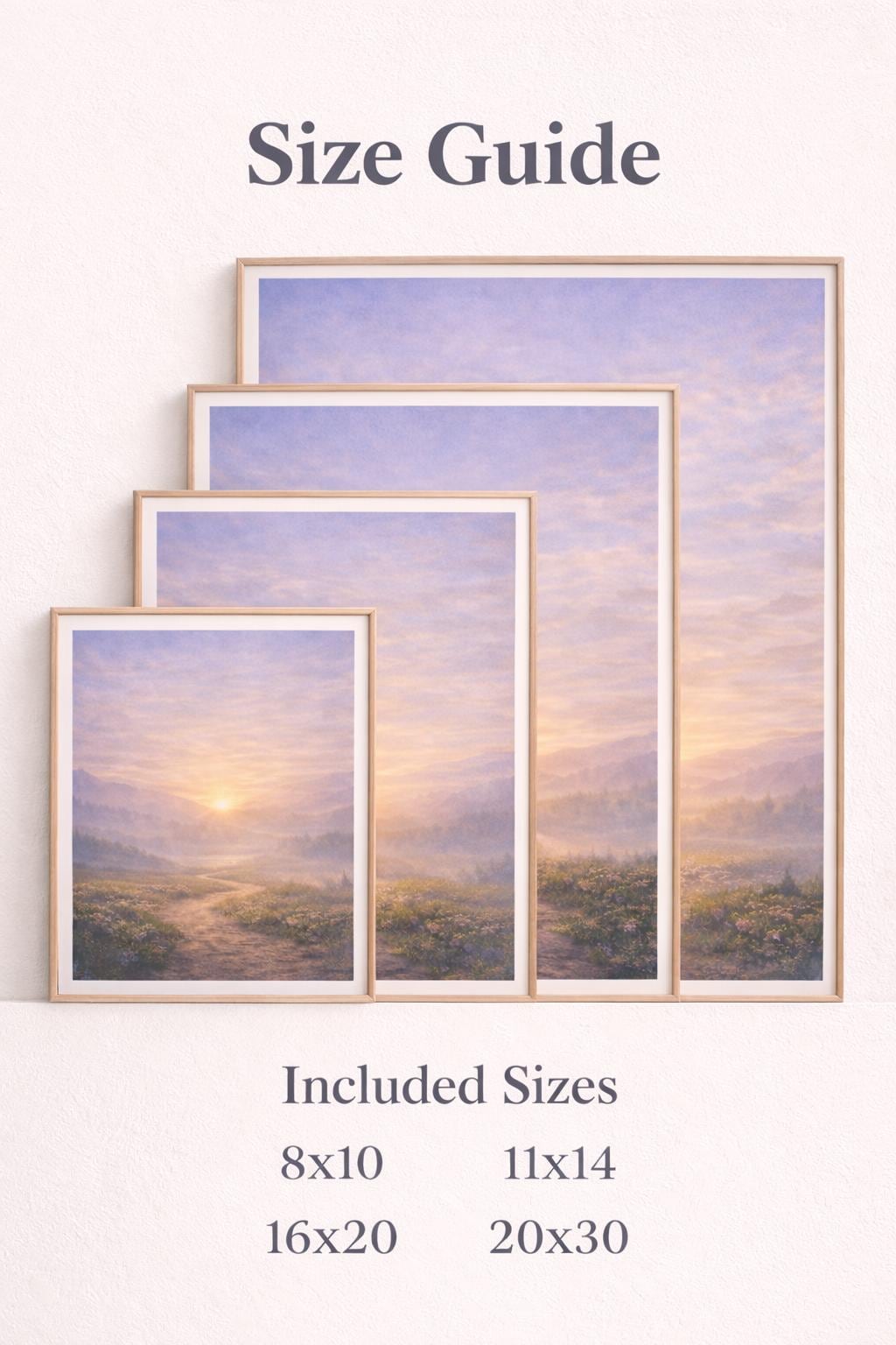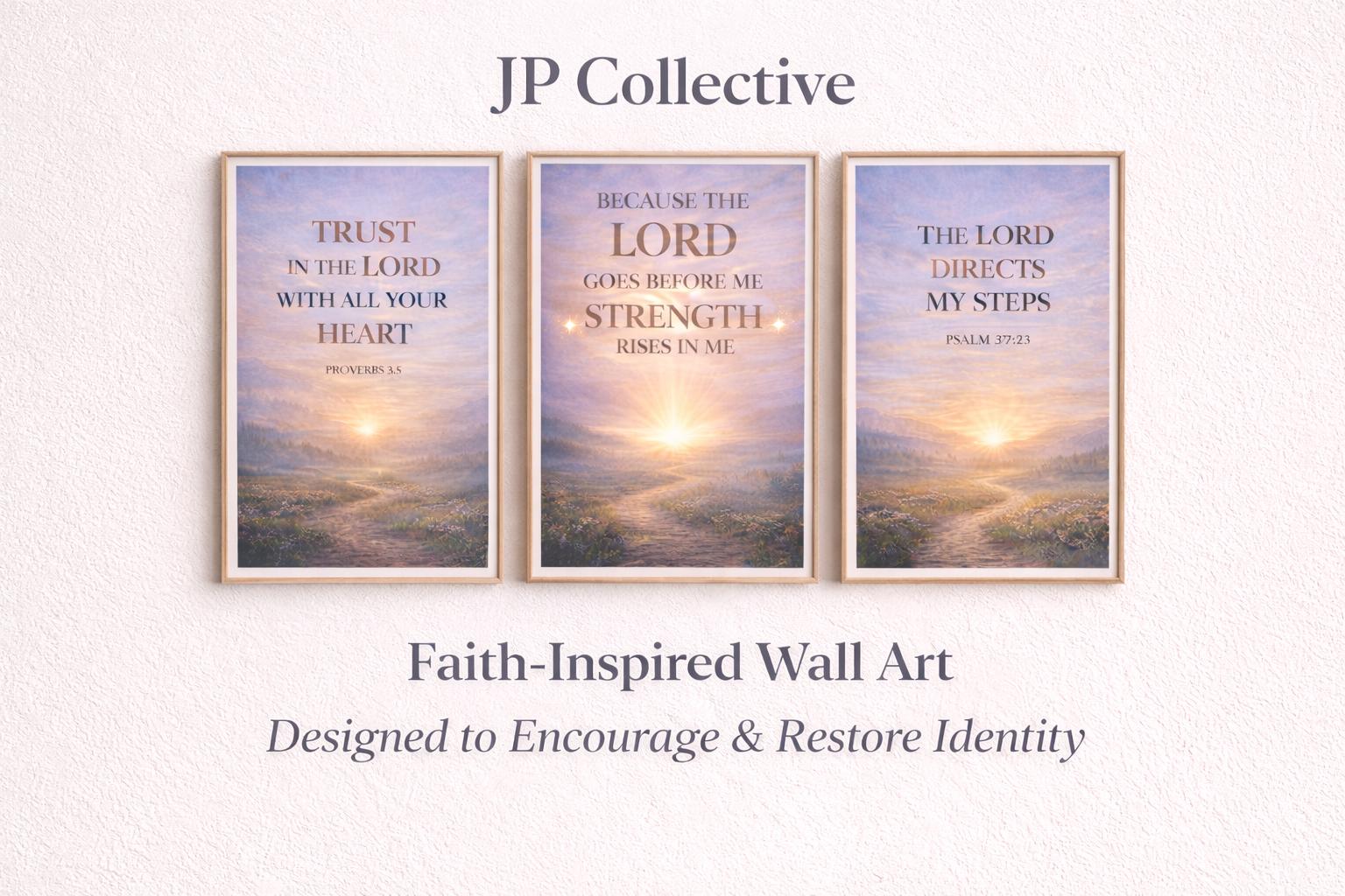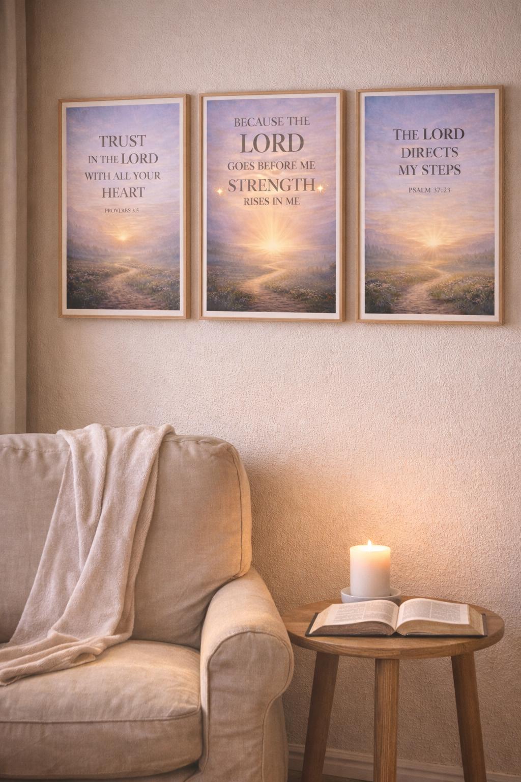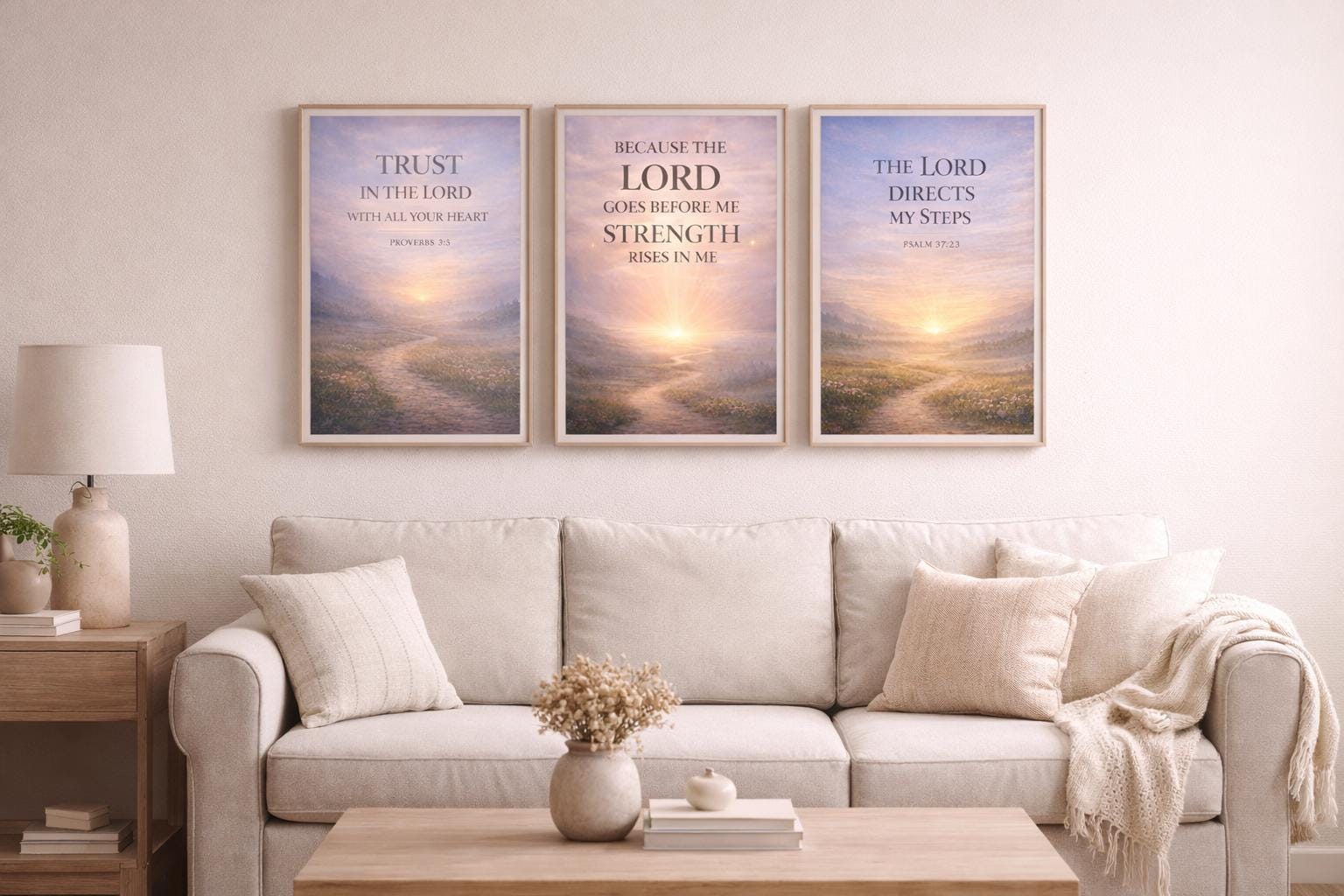 Each piece in this collection reflects a powerful message of faith, courage, and spiritual direction. Designed with peaceful landscape imagery and elegant typography, these prints work beautifully together as a gallery wall or displayed individually throughout your home.