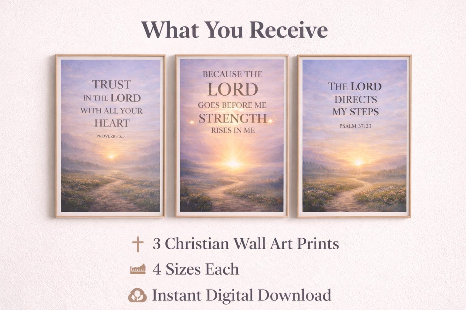 Rebuild your confidence in Christ and surround your space with reminders of God’s guidance and strength. This Christian wall art printable bundle features three scripture-inspired designs created for believers who are rediscovering their identity, purpose, and trust in the Lord.